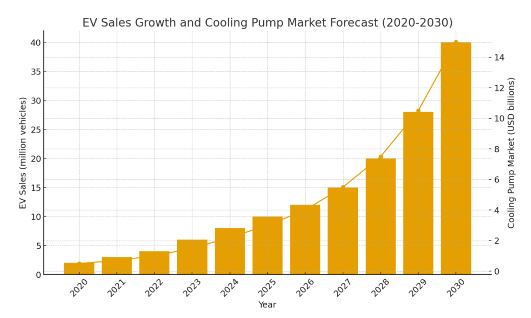 Figure 2. EV Sales and Cooling Pump Market Forecast (2020–2030)